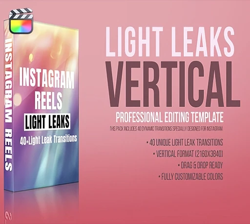Instagram Reels Light Leaks是一款专为Final Cut Pro和Apple Motion设计的竖屏光晕转场特效合集,包含40种独特的光晕效果,呈现梦幻、柔和、电影感十足的视觉氛围。拖拽即可使用,带有运动模糊与发光效果,颜色可完全自定义,无需插件,渲染快速高效。适合婚礼影片、时尚短片、旅行vlog及创意视频项目。